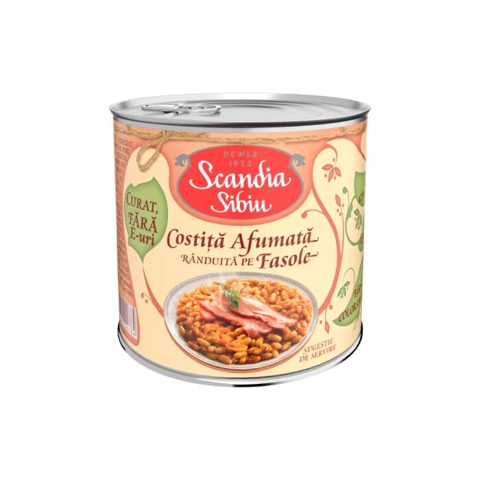 • Ingrediente: Ingrediente: apa, costita de porc afumata (21%) (piept de porc dezosat, fum), fasole alba boabe (18%), ulei de floarea-soarelui, sare, amidon din porumb, condimente, ceapa, pasta de tomate, morcovi, zahar, verdeturi, foi de dafin.
